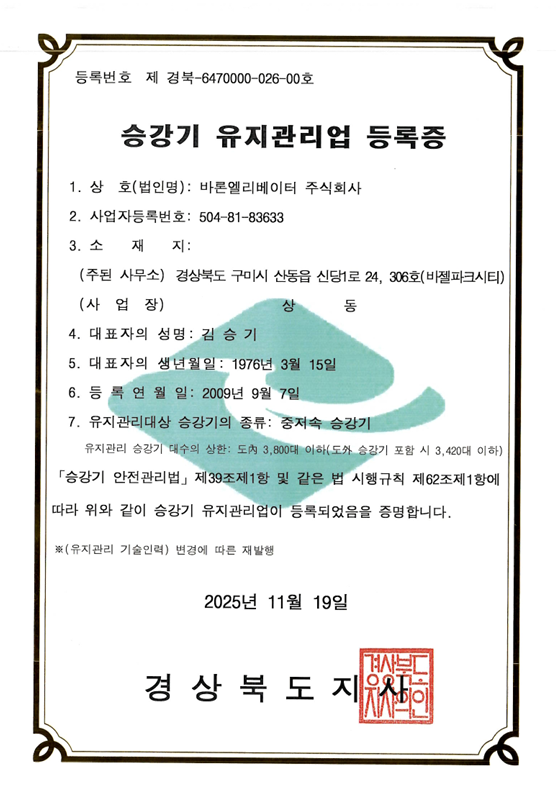 고객의 안전을 위하는 기업, 바론엘리베이터(주)
